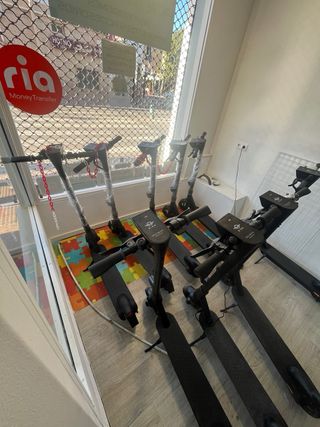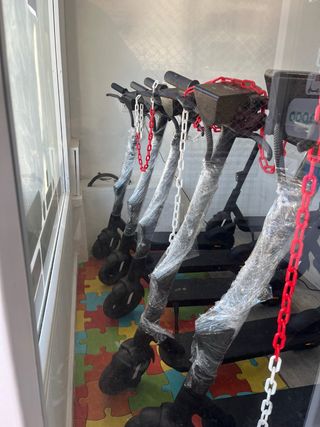 Confezione di cinque monopattini elettrici BIRD. - Monopattini avvolti in plastica protettiva. - Catene di sicurezza rosse e bianche incluse.