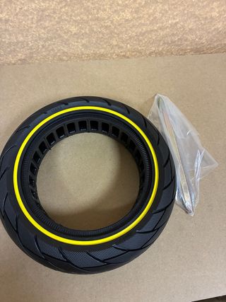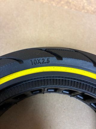 Ruota piena da 10x2.5 con un distintivo cerchio giallo, ideale per monopattini elettrici. Include uno strumento per facilitarne l'installazione. - Misura: 10x2.5 (45mm). - Colore: Nero con cerchio giallo. - Tipo: Piena (senza aria). - Materiale: Gomma resistente.