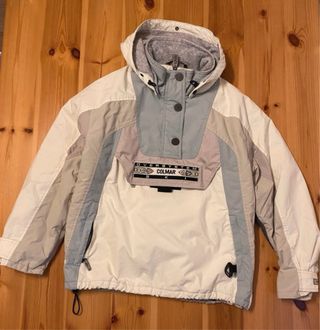 indossata poche volte. Colore bianco, grigio e beige. Con due tasche con cerniera e un tascone sul petto porta skipass. Con cappuccio removibile