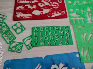 Tavolette stencil in plastica con vari motivi ( animali zoo, fattoria, cavalli, paesaggio, moto, auto) e tre piccole in acetato. Quelle in plastica misurano 28 x 17,5 e 26,5 x 19.