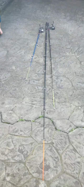 Set di pesca con tre canne e mulinelli, pronto all'uso. Include tre canne di diverse dimensioni, una scatola di accessori da pesca, esche e un kit completo. (Prezzo negoziabile)