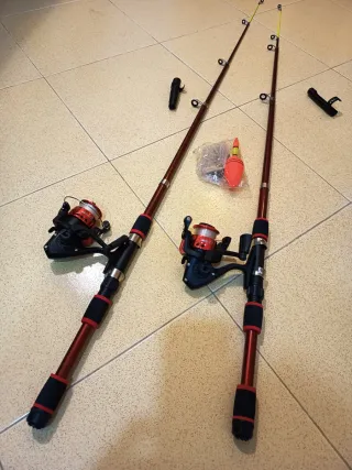 In vendita due canne da pesca lunghe 1,80 metri. Ideali per godere di giornate di pesca. Colore rosso e nero. Include mulinelli. Fornite con galleggiante e accessori.
