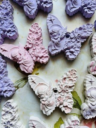 farfalle in gesso, perfette come bomboniere o decorazioni. Sono di colore rosa e lilla esattamente come in foto con colori delicati e presentano un angelo inciso. - 15 farfalle in totale - Motivo angelo e floreale - Realizzate in gesso - Dimensioni 6,5x5,5cm - Perfette per bomboniere o decorazioni