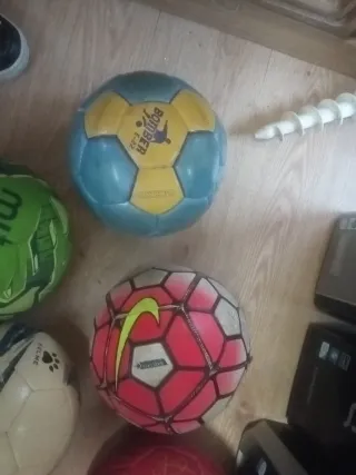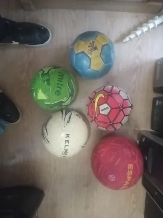 Set di cinque palloni da calcio di diversi colori e marche. - Pallone blu e giallo con design Bomber. - Pallone verde con logo Mitre. - Pallone bianco e blu con logo Kelme. - Pallone rosa con logo Nike. - Pallone rosso con design Spagna. Ideale per allenamenti o partite. Nell'ultima foto, questi due palloni perdono un po' d'aria ma si può giocare, perdendo molto poco. Il lotto intero costa 30€, ogni unità 10€.