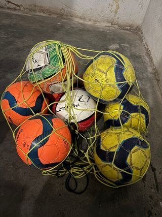 Set di 9 palloni da calcio a 5 e una rete per trasportarli, ideale per squadre, allenamenti, ecc... - Vari palloni di diversi colori e design. - Include una rete a maglie per conservarli e trasportarli comodamente. - Separatamente a 5€ l'unità e 5€ la rete.