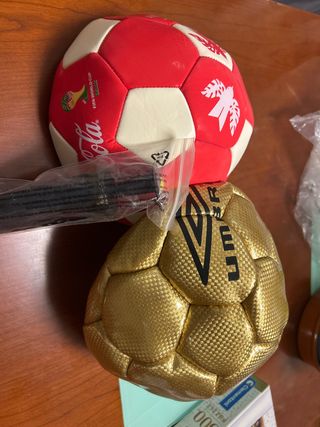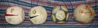 Un pallone commemorativo del Mondiale Italia 1990, un Adidas Questra del Mondiale USA 1994, uno del Doppio dell'Atletico Madrid nel 1996 e uno retrò del giornale 'Marca'; gli ultimi tre hanno firme serigrafate dei giocatori. A 10€ ciascuno o con sconto in blocco. ▪Spedizione tramite Wallapop o consegna a mano tra le 11:00 e le 15:00 in Avenida de la Peseta (Madrid).