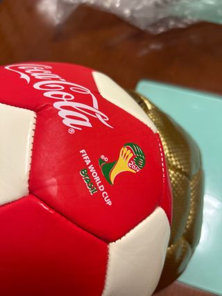 Due palloni da calcio, uno commemorativo di Coca-Cola e il Mondiale in Brasile, e l'altro Umbro dorato. - Pallone rosso e bianco con logo Coca-Cola e FIFA World Cup Brazil. - Pallone dorato con logo Umbro. Non venduti separatamente
