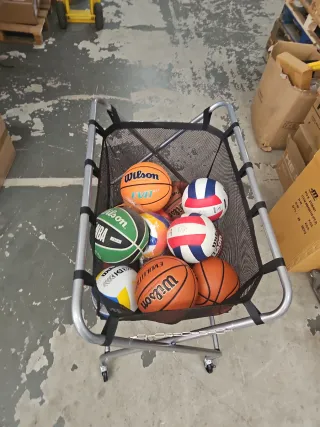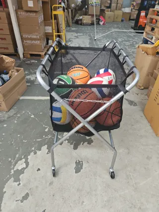 Carrello pratico per trasportare palloni da pallavolo e basket. Ideale per allenamenti o eventi sportivi. Dimensioni: 1 metro x 0,60 x 0,95 metri. Struttura metallica pieghevole, borsa in rete resistente, ruote per facile mobilità.