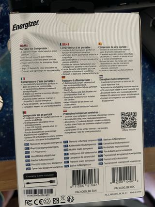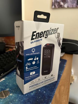 Vendo compressore d'aria portatile Energizer Ultimate, perfetto per auto, moto, bici e palloni. È in ottime condizioni ed è pronto all'uso. - 5 modalità di funzionamento preimpostate - Pressione massima 150 PSI - Spegnimento automatico - Funzione power bank - Luce LED integrata