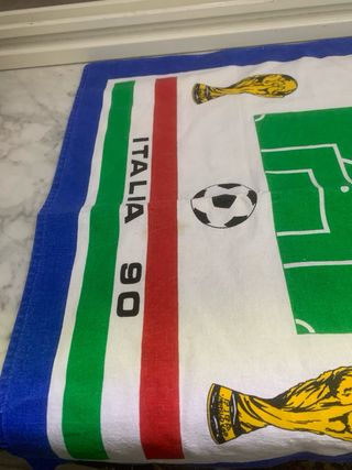 Telo in cotone con design ispirato a Italia '90. - Raffigurazione di un campo da calcio. - Motivo con coppe del mondo. - Decorato con palloni da calcio. - Bordi con i colori della bandiera italiana e blu. Telo in cotone a tema Italia 90, perfetto per gli appassionati di calcio buone condizioni generali presentano delle macchie visibile in foto vendo a 3 euro