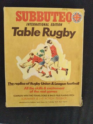 Scatola completa con 2 campi Subbuteo ora gli bali, 4 porte, 2 mischie, 2 piattaforme per lanci, 5 🏈 calciatori di tiri, 2 palloni originali, 4 palloni fatti con semi di frutto, 11 squadre complete. La scatola ha ovviamente i segni del tempo.