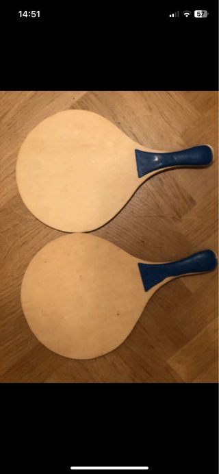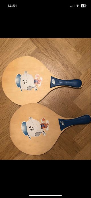 Set di due racchette da spiaggia in legno con simpatici disegni. - Materiale: legno - Design: Orsetto con elicottero e palloni - Manico: blu