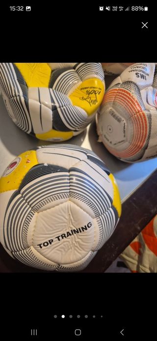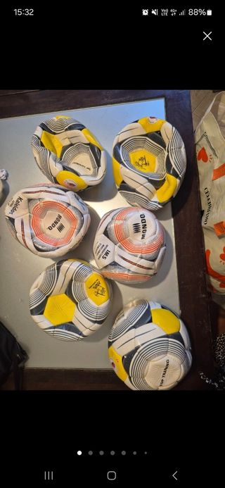 Set di palloni da calcio. - Marca: Mondo - Modello: Top Training - Design con strisce bianche, nere e gialle - Alcuni palloni presentano scritte Kaleidos e IMS International Standard