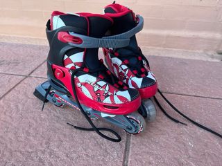 Coppia di pattini inline per bambini, ideali per iniziare a pattinare. 1 SOLO USO. Taglia 32/35 - Design in blu navy e rosso. Chiusura con velcro e lacci per una vestibilità sicura. Ruote resistenti per uno scivolamento fluido.