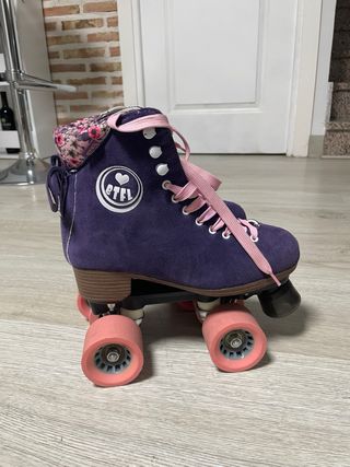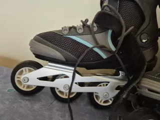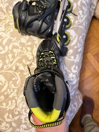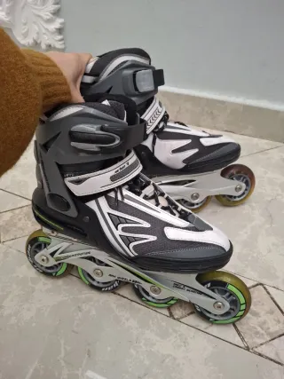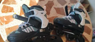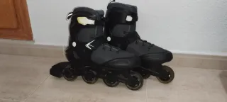 Pattini inline in stile urbano. Utilizzati due volte. Marca Urban 7, specializzata in pattinaggio. Incluso il freno. Chiusura con lacci, velcro e fibbia, con rinforzo e sicurezza. Stivali imbottiti per maggiore comfort.