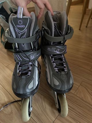 Pattini in linea Oxelo taglia 39. Poco usati, protezioni non aperte. Colore grigio e blu. Chiusura con lacci e velcro.