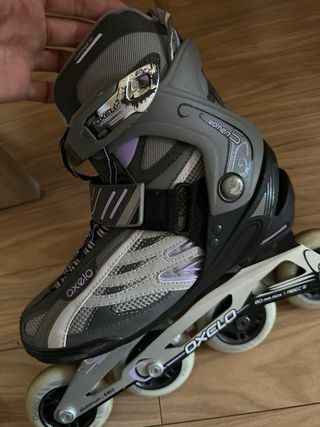 Pattini inline Oxelo da donna, progettati per offrire comfort e stile. Con borsa da trasporto. Utilizzati pochissimo. - Colore grigio con dettagli in viola. - Chiusura con lacci, velcro e fibbia. - Ruote per pattinaggio inline.