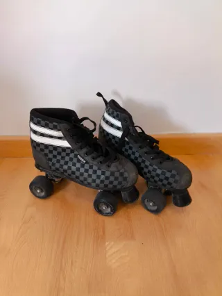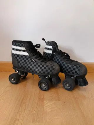 Pattini quad del marchio Rookie con un design a quadri grigi e neri. Design a quadri grigi e neri. Lacciuoli neri. Dettaglio a righe bianche alla caviglia.