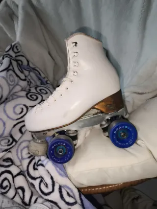 Pattini artistici Risport con scarpa taglia 245. - Scarpa bianca. - Ruote blu. - Chiusura con lacci. Marca RISPORT piastra STD. Usati ma in buone condizioni.