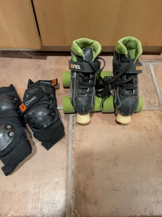 Set di pattini e protezioni per bambini. - Pattini neri con dettagli verdi. - Include ginocchiere, gomitiere e polsini. - Marca Oxelo sulle protezioni. Taglia 28-30