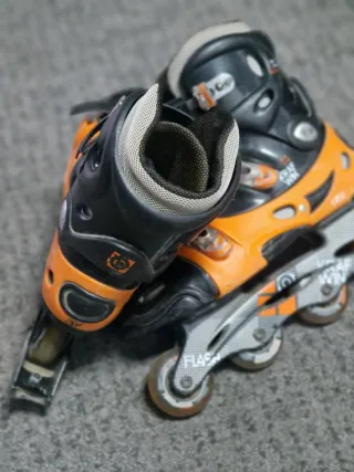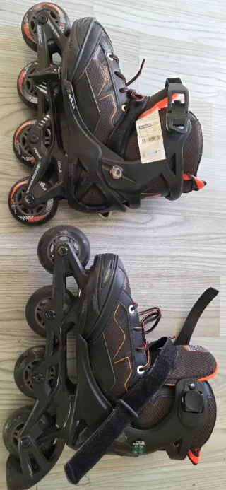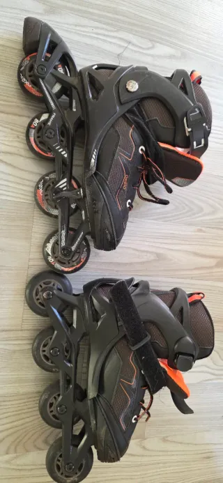 Pattini inline di colore nero e arancione. - Taglia 43. - Chiusura con lacci, velcro e fibbia. - Ruote in poliuretano.