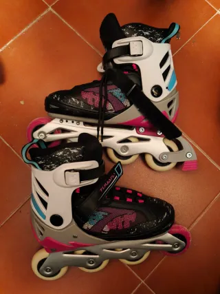 Pattini in linea grigi e bianchi, con dettagli in rosa di Decathlon. Taglia 35-38. Sono regolabili e perfetti per imparare. - Taglia regolabile da 35 a 38. - Chiusura con velcro e fibbia. - Ruote da 70 mm.