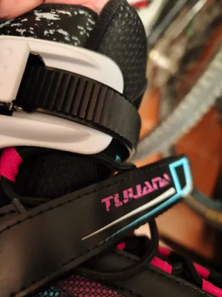 In vendita pattini inline della marca Tijuana. Ideali per godersi passeggiate e praticare pattinaggio. Design moderno con dettagli in rosa, blu e nero. Chiusura con velcro e lacci per un'aderenza sicura. Ruote rosa e bianche. Usati 2 volte.