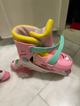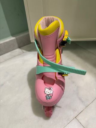 Pattini inline per ragazze con design Hello Kitty. Regolabili per adattarsi alla crescita. Taglia 27-30. Uso minimo. Colore rosa e giallo. Chiusura con velcro e fibbia. Decorazione Hello Kitty.