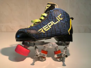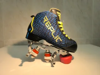Pattini da hockey REPLIC taglia 32. Progettati per offrire buone prestazioni. La scarpa sinistra è più usurata, perché mio figlio faceva il portiere. - Colore blu con dettagli in giallo. - Chiusura con lacci. - Base in alluminio Queen Skate 100