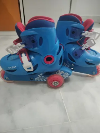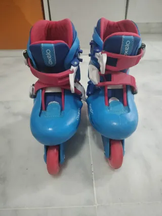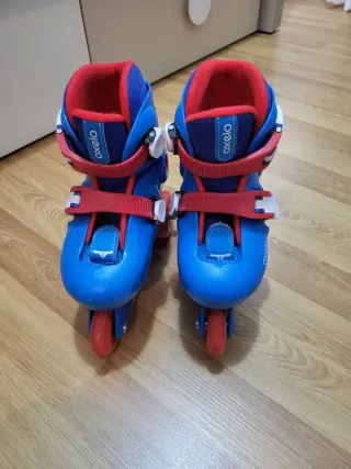 Pattini inline del marchio Oxelo, ideali per iniziare a pattinare. - Colore blu con dettagli rossi. - Chiusura con velcro e fibbia. - Ruote rosse.