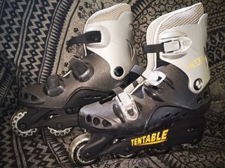 Pattini inline Tentable, nº 41 - 42. Fibbie e stivale in ottime condizioni (solo piccoli graffi superficiali). Ruote e freni senza usura, avendo avuto poco utilizzo. In regalo set di ginocchiere regolabili per adulti e coperture per le ruote.