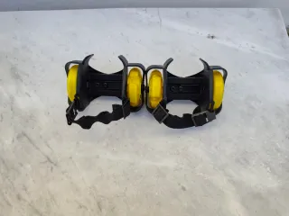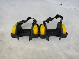 Ruotine regolabili per scarpe, noti anche come pattini con ruote attaccabili o 'heelys'. Si attaccano alla parte posteriore di qualsiasi scarpa. Hanno ruote gialle. Includono cinture regolabili per una vestibilità sicura. Adatti a qualsiasi taglia. Ideali per bambini e principianti che imparano a pattinare.