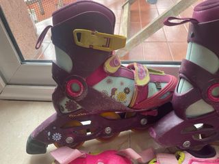 Pattini in linea rosa e blu, taglia 28-30. Marca Decathlon. Chiusura con velcro e fibbia. Ruote da 70mm.