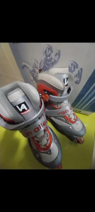 Pattini in linea del marchio Van Allen, nuovi di zecca. Taglia 33-37 regolabile. Design in grigio e arancione. Chiusura con velcro e fibbia.