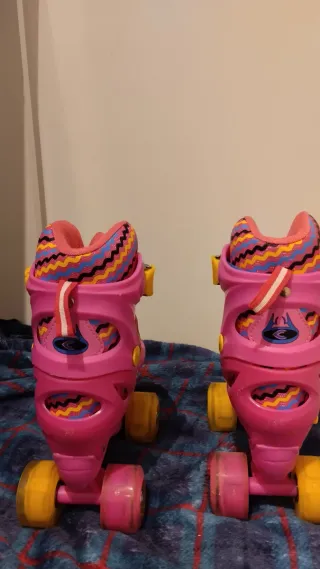 Pattini a quattro ruote con design divertente e regolabile. Colore principale: rosa. Dettagli in blu e zig-zag multicolore. Chiusura con velcro e fibbia. Ruote gialle e rosa.