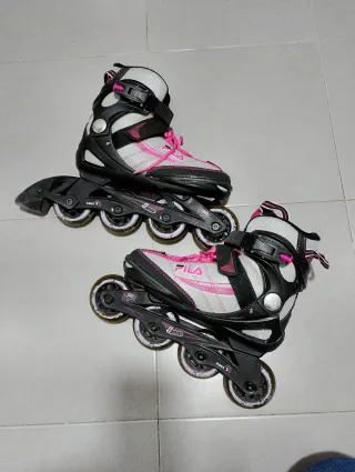Pattini inline del marchio Fila, ideali per principianti o pattinatori occasionali. Il design combina il nero con dettagli rosa. Taglia regolabile da 32 a 36. Chiusura con velcro e lacci per una vestibilità sicura. Ruote in poliuretano.