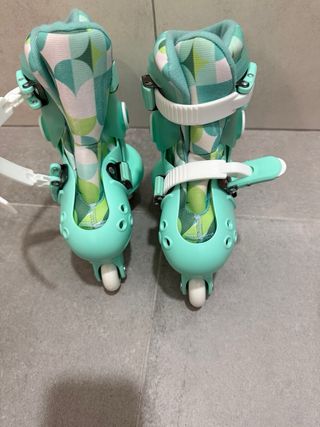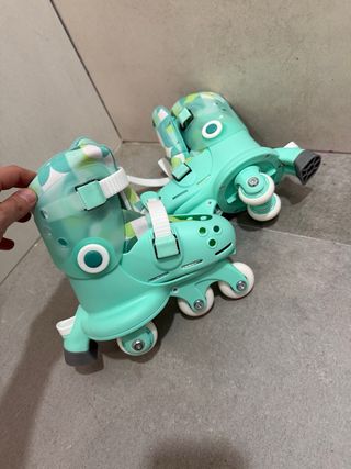 Pattini inline di colore blu e verde, ideali per imparare a pattinare. Sono regolabili per adattarsi alla crescita del piede. Taglia ajustable da 26 a 30. Design accattivante in blu e verde. Chiusura con velcro e fibbia per maggiore sicurezza. Ruote singole o triple per maggiore stabilità.