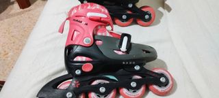 Pattini per bambini ragazza in colore rosa, di Decathlon, sono regolabili dalla taglia 23 alla 28. Hanno pochissimo utilizzo. Chiusura con velcro regolabile. Ruote resistenti.