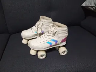 Pattini del marchio Oxelo in bianco, ideali per ragazze. Design stivaletto. Dettagli iridescenti sui lati. Chiusura con lacci. Ruote bianche. Prezzo negoziabile.