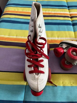 Pattini a rotelle bianchi con dettagli in rosso. Design classico a stivale alto. Lacci rossi. Ruote rosse. Molto usati ma ben conservati. Taglia 29-33. Protezione per pattini (manca una ginocchiera).