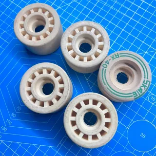 Set di 4 rotelle per pattini RX-40 in stile vintage +1 ricambio totale 5. Le rotelle presentano una finitura in legno chiaro con dettagli verdi. - Set di 4 rotelle. - Design RX-40 con scritte SKATE.