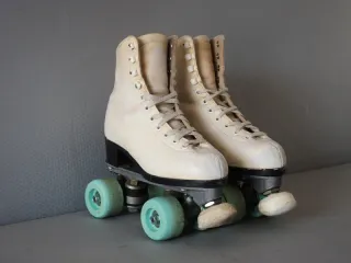 In vendita pattini a rotelle color beige. Sono comodi e perfetti per iniziare. - Chiusura con lacci bianchi. - Ruote di colore bianco. - Design classico a stivaletto. Taglia 39