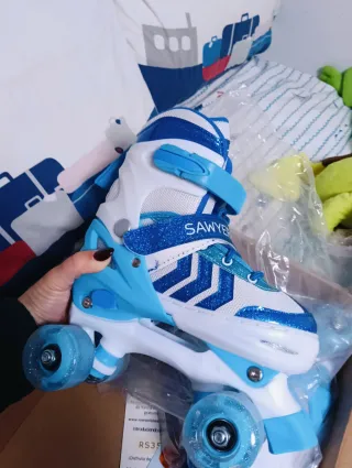 Pattini a rotelle per bambini con un design accattivante in bianco e blu. - Ruote con brillantezza. - Chiusura con velcro e lacci. - Marca Sawyer.