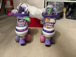 Pattini a rotelle per bambina con un design colorato e divertente. - regolabili dalla taglia 28 alla 31 - rotelle che si illuminano con il movimento - Decorazioni arcobaleno e stelle. - Colore principale viola e bianco. - Chiusura con velcro e lacci. - segni di usura visibili in foto - in confezione originale - con accessori e ricambi originali