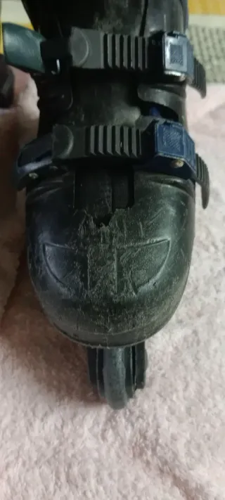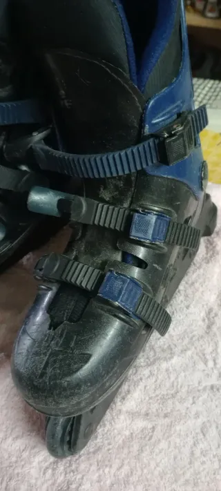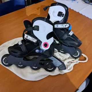 Pattini roller per bambini, ideali per iniziare a divertirsi sulle rotelle. Sono comodi e regolabili. Misura 34/35 - Chiusura con velcro e fibbie. - Design sportivo nero e blu. - Struttura robusta. -stivaletto interno removibile e lavabile - cuscinetti ruote lubrificati Qualche segno del tempo ma ancora ottimi , ideale per iniziare l'attività di pattinaggio roller