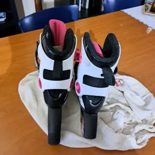 Pattini a rotelle per bambina, misura 34-36. - Colore nero e bianco. - Dettagli rosa. - Chiusura con velcro e fibbia.