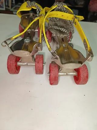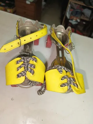 Coppia di pattini a rotelle risalenti agli anni '70. Presentano una struttura in metallo con lacci gialli e cinturino. - Pattini vintage - Colore giallo e argento - Modello anni '70