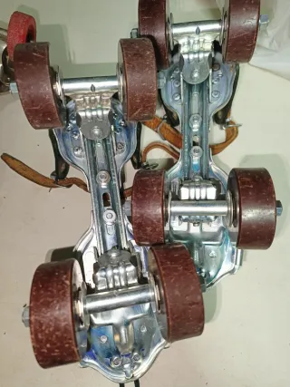 Pattini a rotelle vintage risalenti agli anni '60. - Struttura in metallo. - Ruote in materiale scuro. - Cinghie in cuoio per il fissaggio.