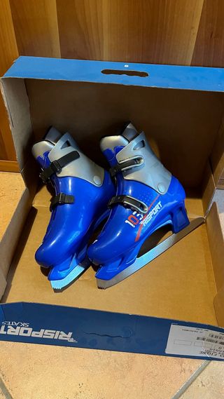 Pattini da ghiaccio marca Risport, taglia 42, mai usati. - Colore blu e grigio. - Chiusura con fibbie. - Ideali per principianti
