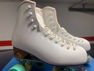 Pattini artistici Risport Venus, taglia 23,5. Plancia Variant e ruote complex Felix HD52. Include un set di 8 ruote extra Roll line con cuscinetti Komplex ABEC 5 Black Carbon (quattro 47D e quattro 49D), ideale per parquet. Le ruote extra sono state usate per un mese. I pattini (che includono lacci, non visibili nella foto) hanno dato il massimo ma hanno ancora molta vita e sono perfetti per iniziare a competere (considerando che si usano con protezioni e i graffi non saranno visibili). Nuovi costavano più di 300€. Include scatola originale. Modello: Giotto. Durezza: 49D-057. Colore: Blu e beige.